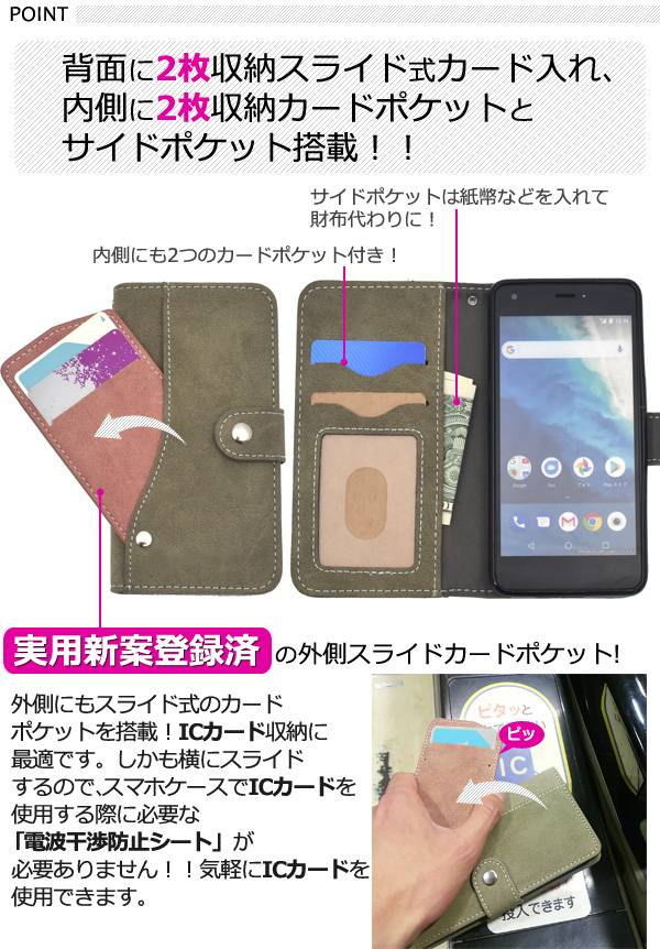 しかも横にスライドするので、スマホケースでICカードを使用する際に必要な 「電波干渉防止シート」が必要ありません!!気軽にICカードを使用できます。