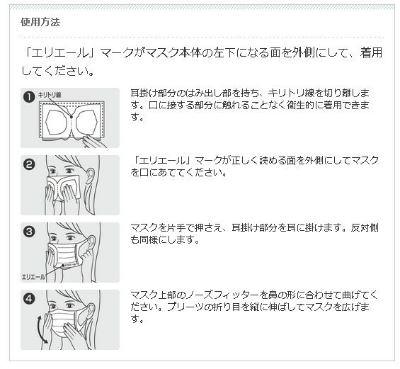 耳掛け部分は顔に触れない面に折り込まれているので、着用時には口に接する部分に触れることなく衛生的に着用できます 使用上・保管上の注意 かゆみ、かぶれ等の症状があらわれた場合は、使用を中止してください。